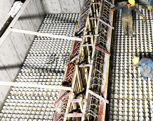 這是因為整體澆筑ABS濾板立體綁扎鋼筋和池壁的預埋鋼筋左右能成網狀結構和濾梁的預埋鋼筋上下形成立體結構,極大的提高了濾板整體荷載力和抗沖擊力。這是小塊預制濾板的預埋螺栓無法實現(xiàn)的。在曝氣生物濾池中濾料層的填充高度往往高達4m,因此荷載要高于給水中的濾池。